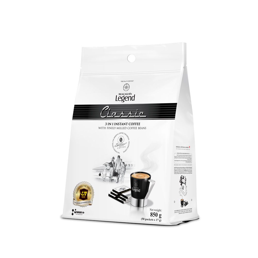 Dựa trên nền tảng hương vị của Cà phê G7, cà phê Legend Classic sử dụng công nghệ Nano làm cho hương vị cà phê thêm tươi mới. Quy cách: 17gr x 50 gói/ bịch ; 10 bịch/thùng